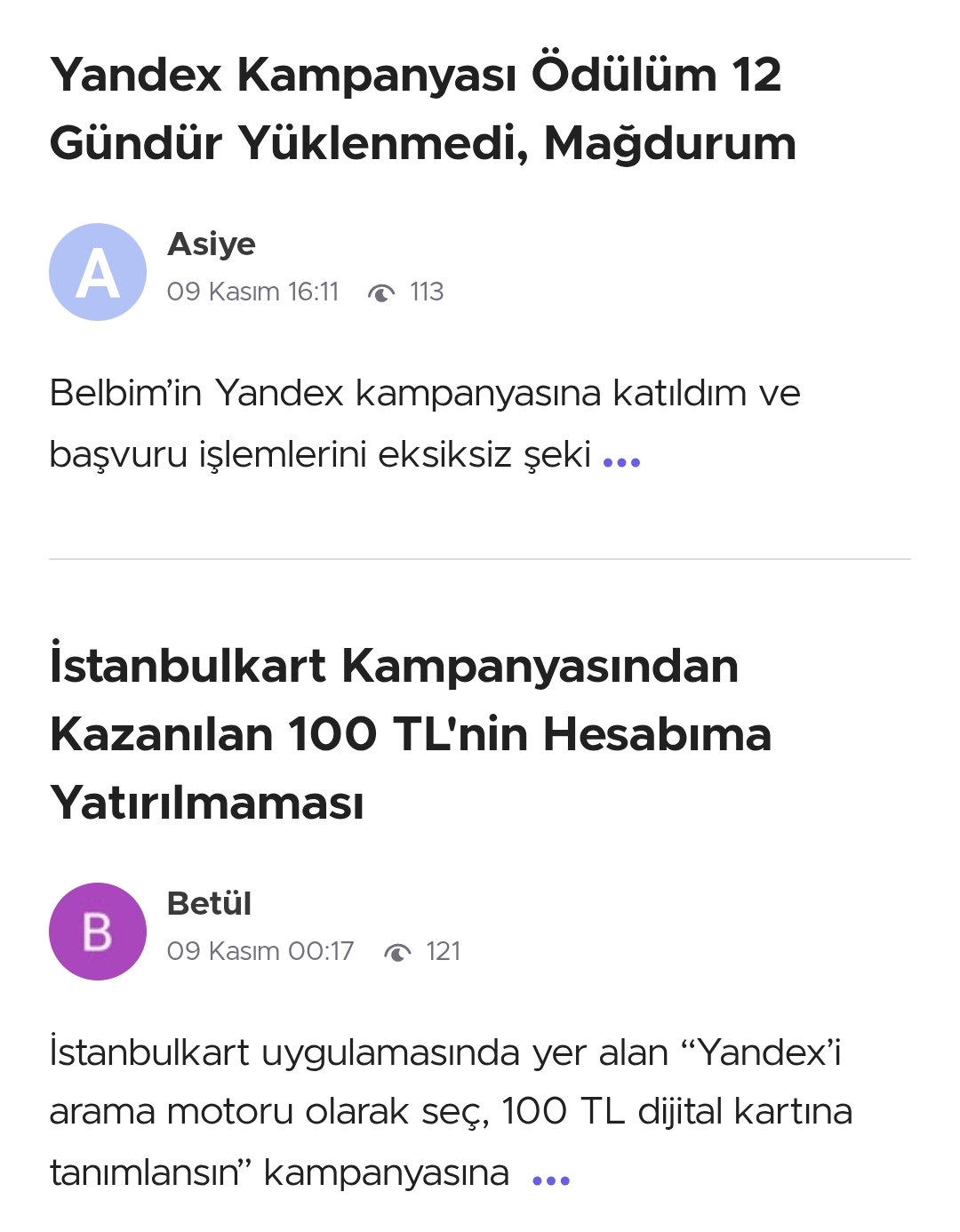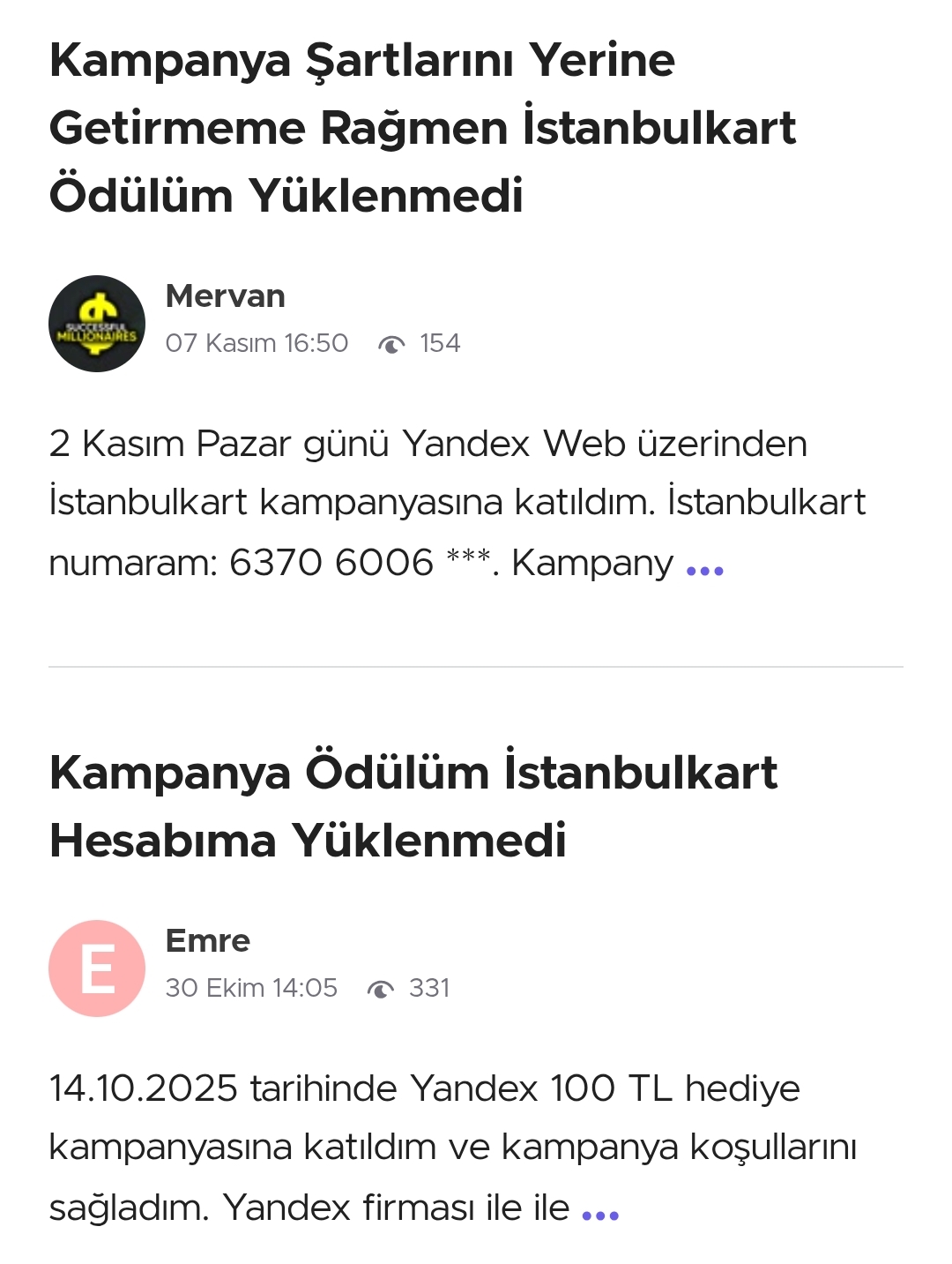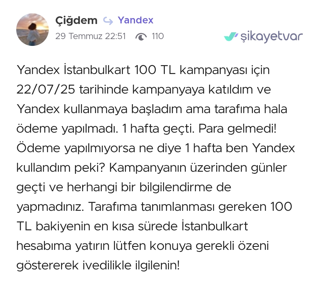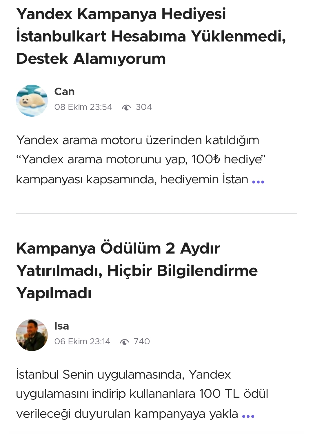 Birçok kullanıcı, “Kampanya var dediler, para yok”, “Hem Yandex hem İBB bizi oyalıyor” gibi yorumlarla yaşadıkları mağduriyeti paylaşıyor.