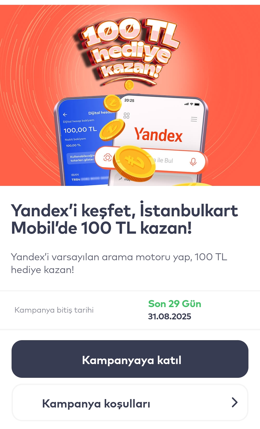 İstanbul Kart uygulaması kullanıcılarına, Yandex’i birincil arama motoru yapanlara 100 TL yükleneceği duyurulmuştu.