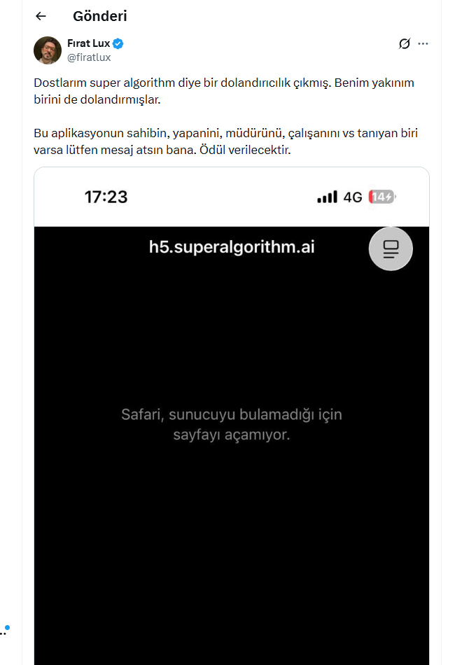 X platformunda @firatlux kullanıcı adlı kişi, “Super Algorithm” adıyla anılan bir uygulamaya ilişkin ciddi dolandırıcılık iddiaları gündeme getirdi. Paylaşımında yakın çevresinden bir kişinin bu uygulama üzerinden mağdur edildiğini belirten kullanıcı, uygulamayla bağlantısı bulunan kişileri aradığını ifade etti.