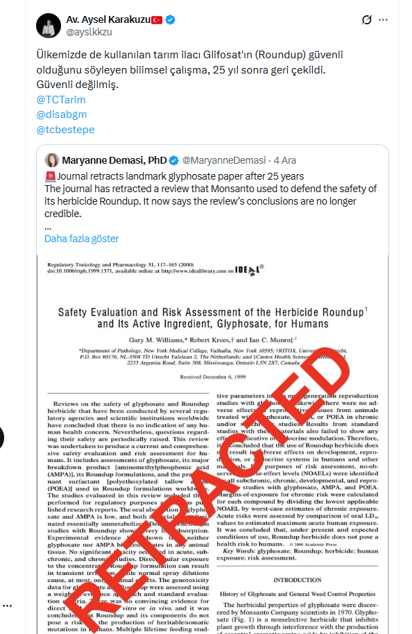 Bayer&Monsanto tarafından tüm dünyaya 'tarım ilacı' olarak pazarlanan ancak Dünya Sağlık Örgütü tarafından kanser yapıcı olduğu ilan edilen glisofat içerikli ürünlerin "güvenli" olduğu yönünde bundan tam 25 yıl önce 2000 yılında "Regulatory Toxicology and Pharmacology" dergisinde yayınlanan makale geri çekildi.
